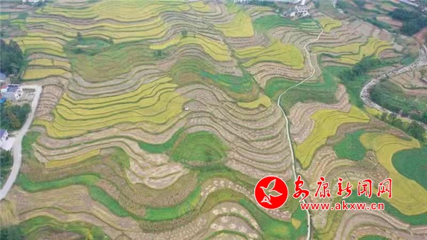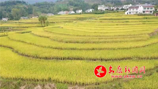 本網(wǎng)訊(通訊員 黃智發(fā) 王建霞)金秋時(shí)節(jié),漢陰縣鳳堰古梯田的水稻進(jìn)入成熟期。在青山白云映襯下,層層疊疊的梯田翻起金色的稻浪,美如畫(huà)卷。