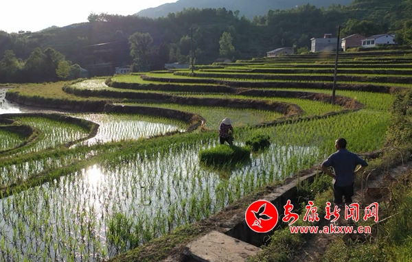 放眼望去,層層梯田披上了一襲綠色的新裝,微風(fēng)吹過,秧苗輕輕搖擺,蕩漾起無限生機。在持續(xù)兩周的插秧期,村民們每天從早上六點一直忙到下午七點鐘才收工,“手把青秧插滿田”的農(nóng)忙景象與大大小小形狀各異的水田,構(gòu)成一幅詩意盎然的田園風(fēng)光圖。