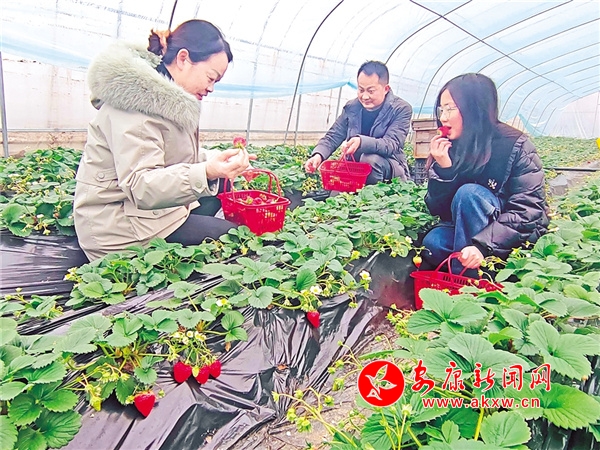 草莓溫室大棚里暖意融融,綠油油的草莓葉子下掛滿了一排排緋紅的草莓,顆顆嬌艷欲滴、紅得發(fā)亮,工人們正在忙碌地采摘訂單草莓,前來體驗采摘樂趣的小朋友忍不住滿園草莓濃郁的清香,邊摘邊開心地吃了起來。