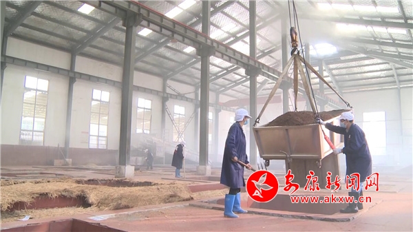 在漢陰縣雙乳鎮(zhèn)三同村頤品莊園酒廠標準化廠房車間里,工人們來回穿梭,在各自崗位上抓生產(chǎn)、趕進度。釀酒車間里,新出爐的酒糟熱氣騰騰,工人們快速將其攤晾,冷卻后又開始揮鏟拌曲,進入下一輪的裝窖發(fā)酵;蒸鍋旁,工人鉚足干勁,一層一層均勻加料上甑,熟練地進行各項工序。