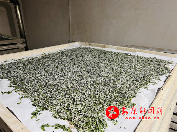 一大早,小蠶共育基地的技術(shù)員們就忙得熱火朝天,只見他們依次拉開一箔箔三齡小蠶,先撒上一層薄薄的新鮮石灰粉進(jìn)行蠶體消毒,再撒上切好的新鮮桑葉,這是小蠶在共育室里吃的最后一頓“早餐”,“早餐”吃罷它們就將被分發(fā)到各養(yǎng)蠶戶家中,直到吐絲結(jié)繭完成它們的使命。