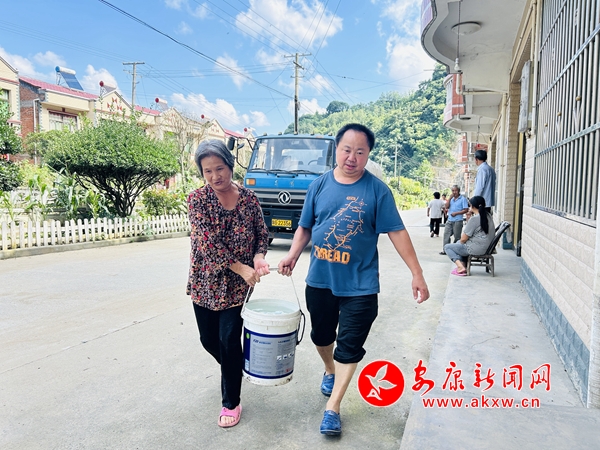 7月21日,再見到張世軻時(shí),他正忙著給村里的群眾送水,受強(qiáng)降雨影響,該村的供水工程管網(wǎng)和設(shè)施沖毀受損,鎮(zhèn)上組織了送水車解決村民用水問題。對(duì)于行動(dòng)不便的群眾,張世軻主動(dòng)幫助接水,并送水到家。
