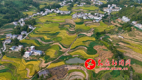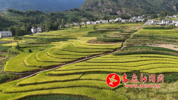 鳳堰梯田的1.2萬(wàn)畝連片水稻迎來(lái)了豐收季,蜿蜒盤旋的金黃色線條從山腳盤繞至山腰,層層疊疊的稻田與整潔的村莊、蜿蜒的道路、遠(yuǎn)方的青山相映成趣,美不勝收。農(nóng)戶們也搶抓晴好天氣,確保顆粒歸倉(cāng),勤勞的鄉(xiāng)親們穿梭在稻田中,構(gòu)成了一幅祥和而廣闊的秦巴山區(qū)農(nóng)耕文明美麗畫卷。