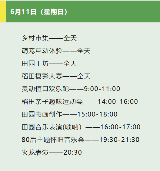 當(dāng)日,現(xiàn)場(chǎng)還舉辦了稻田拔河、稻田摸魚、稻田摔跤等娛樂活動(dòng)和田園古箏表演、70后主題懷舊音樂會(huì)、火龍表演等演出活動(dòng),吸引眾多游客朋友前來打卡。6月11日,靈動(dòng)恒口歡樂跑、親子趣味運(yùn)動(dòng)會(huì)、嗩吶音樂表演、80后主題懷音樂會(huì)等活動(dòng)精彩繼續(xù)......