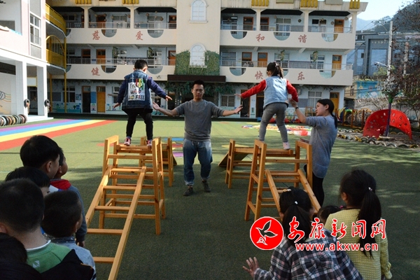 在該縣第二幼兒園,來自新北區(qū)銀河幼兒園教師魏劍正和小朋友們在室外活動,在他的不斷引導鼓勵和示范帶動下,小朋友們大膽嘗試高空過木橋。