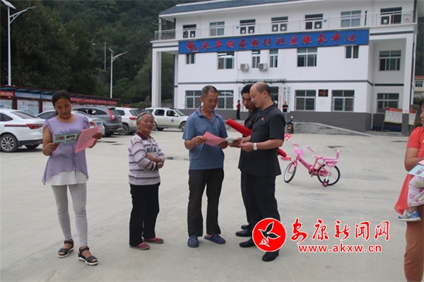 為更好地達到宣講效果,宣講團成員提前到周邊移民搬遷安置點、村組院落發(fā)放掃黑除惡專項斗爭、平安建設(shè)、“無訟新村”等宣傳單共計300余份,吸引60余名群眾參與到宣講活動現(xiàn)場。