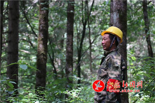 上山途中,朱忠銀邊走邊四處觀察,有什么異常情況會及時排除并記錄下來,看到垃圾隨手撿起。日復一日,風雨無阻,他每天都要“鉆山溝、爬樹林”往返穿梭好幾次,管理著3200畝原始次生林,他用默默守護換來滿山蒼翠,守護著家鄉(xiāng)的這片綠色資源。
