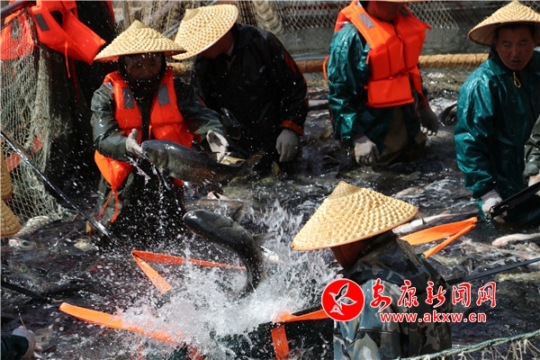 本網(wǎng)訊(通訊員 廖霖 楊敏麗 邱萌 )一條條肥美碩大的花鰱和白鰱歡騰雀躍,在一張張大網(wǎng)的包裹下被捕撈上岸。網(wǎng)中魚兒蹦蹦跳,岸上漁民彎腰笑,水花四濺,魚兒歡騰繪制出了一幅“魚躍人歡漁家樂”的精美畫卷。連日來,嵐皋縣嵐宮湖水庫生態(tài)魚養(yǎng)殖基地呈現(xiàn)出水清魚肥,魚肥民富的動人景象。