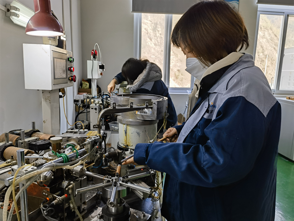 12月19日,安康蘇陜誠銘電子科技有限公司員工在操作機(jī)器繞音圈。