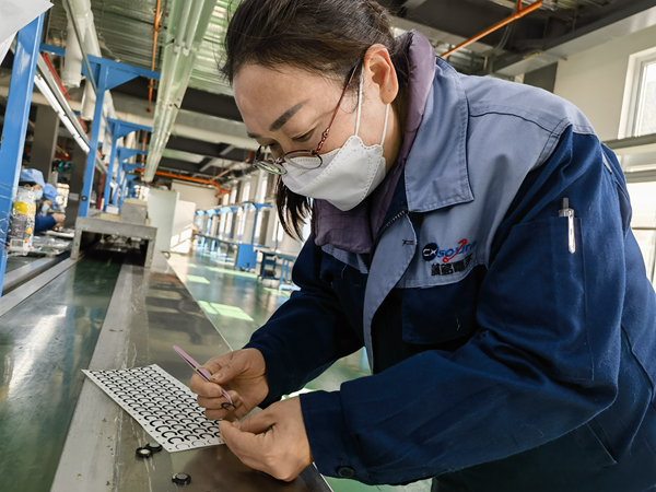 貼阻尼是啥活兒呢?為了滿足筆者的好奇心,龍饒慧就跟筆者做了介紹。原來,那是在音圈經(jīng)過盆架瓷碗打膠、防磁貼、磁鐵點(diǎn)膠、裝入華司、扣瓷規(guī)、磁組固化、脫瓷規(guī)、點(diǎn)PCB板固定膠后的一道工序。為了讓筆者看明白,龍饒慧還做了示范,只見他左手熟練捏起拇指大的揚(yáng)聲器邊緣,右手用鑷子鉗起粘在紙板上的阻尼,很快地貼了上去,筆者看了一下時(shí)間,她完成整個(gè)動(dòng)作剛好用了10秒。