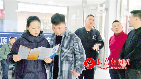 在嵐皋縣人社局靈活用工市場現(xiàn)場,外賣騎手劉少兵正帶著朋友咨詢了解工作信息。期間不斷有求職者前來咨詢、填寫求職信息、簽署勞動合同,工作人員悉心為求職者提供就業(yè)服務。