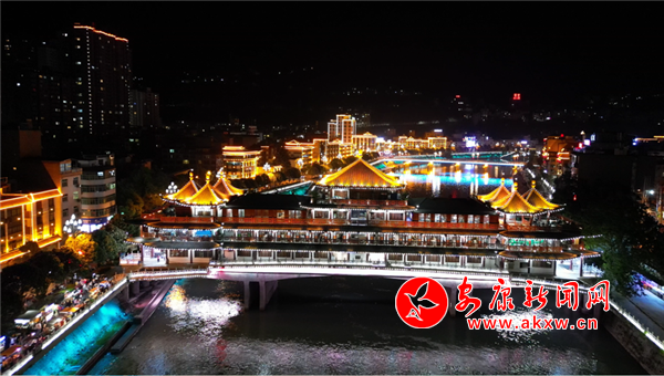 華燈初上,從露營(yíng)基地回到縣城,大街上人來(lái)人往熱鬧非凡。位于縣城中心的河街美食街散發(fā)著濃濃的煙火氣,各色美食吸引了不少游客前來(lái)打卡。沿著河濱休閑步道漫步,兩岸燈光將嵐河渲染得絢麗多彩,橫跨嵐河之上的廊橋也在夜色中散發(fā)著迷人的光影。