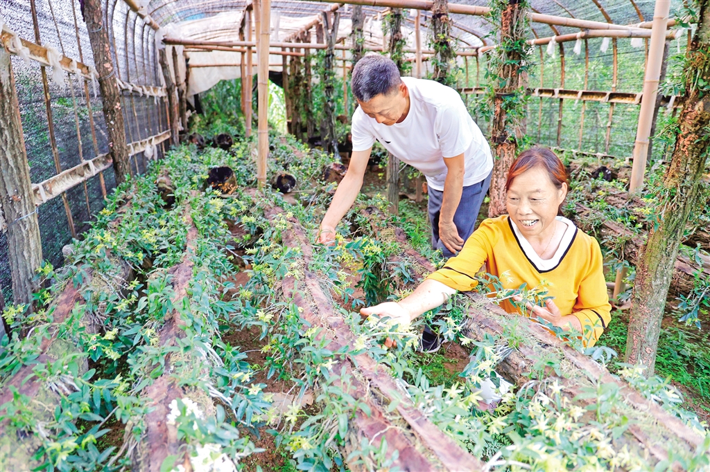 大道河鎮(zhèn)月池臺村四組胡德銀與妻子查看鐵皮石斛的生長情況。張?zhí)毂?攝Ej7安康新聞網(wǎng)