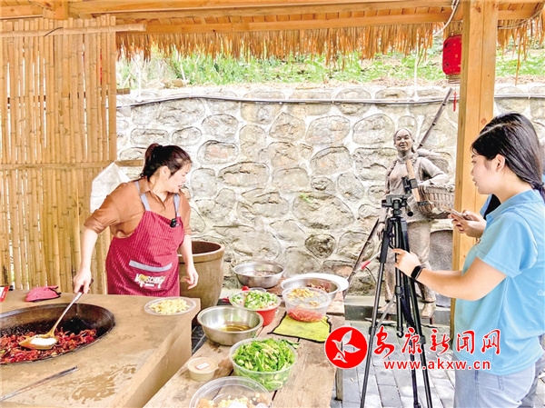 “大家好,我是三翠姐,今天我給大家炒一個(gè)嵐皋特色美食——酸辣魔芋豆腐!它酸辣鮮香,嫩滑爽口,富含豐富的膳食纖維……”在嵐皋縣四季鎮(zhèn)楊家院子非遺作坊小院……