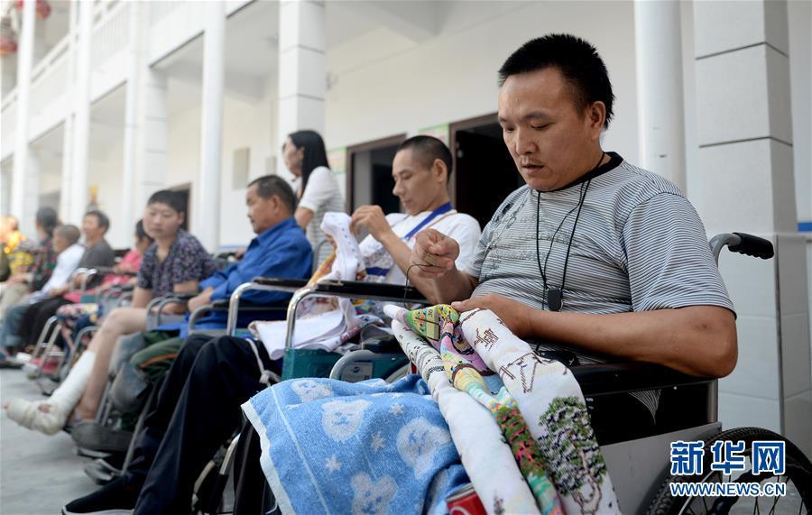 寧陜縣中心敬老院五保失能托養(yǎng)中心內,托養(yǎng)人員張朝兵(右一)、何永龍(右二)在繡十字繡(8月20日攝)。張朝兵、何永龍都在意外事故中造成高位截癱,家中無人照料。進入托養(yǎng)中心后他們開始學習繡十字繡,除了政府補助之外還能通過自己的手藝補貼家用。 yCp安康新聞網