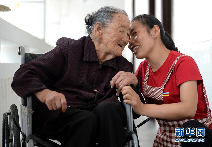 寧陜縣中心敬老院五保失能托養(yǎng)中心內(nèi),護理員吳偵梅(右)在與托養(yǎng)老人毛榮芝聊天(8月20日攝)。