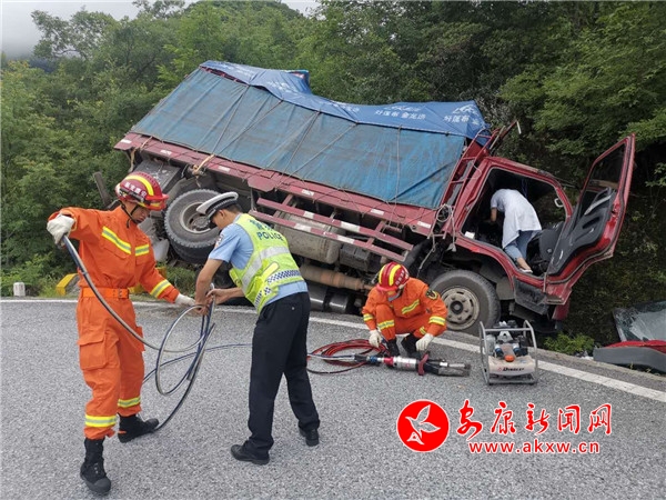 受西漢高速路面養(yǎng)護(hù)施工,貨車實(shí)施交通管制影響, 210國道貨運(yùn)車輛激增,交通安全形勢突然嚴(yán)峻。7月17日中午13時(shí)許,一輛倉柵式輕型貨車滿載一車貨物,由成都沿210國道前往河南,行駛至210國道1392公里+100米處與道路左側(cè)山體碰撞,車頭被撞癟,駕駛員下半身被卡在駕駛室無法脫困,生命垂危。副駕駛被甩出車外。接警后廣貨街中隊(duì)迅速出警,第一時(shí)間趕到現(xiàn)場,迅速組織各救援單位開展施救。隨后,醫(yī)護(hù)人員、消防官兵、保險(xiǎn)業(yè)務(wù)員先后到達(dá),四家單位有條不紊地聯(lián)合救援即刻展開。交通警察對事故路段臨時(shí)性實(shí)施交通管制,防止發(fā)生次生事故。同時(shí)配合消防官兵對卡在車內(nèi)的駕駛?cè)诉M(jìn)行施救。醫(yī)護(hù)人員對傷員進(jìn)行前期救治,包扎、輸液、輸氧。保險(xiǎn)公司派出救援車輛對遺散的貨物進(jìn)行收集,對受困車輛進(jìn)行施救。歷時(shí)兩個(gè)小時(shí),受困人員被救出,送醫(yī)院治療。