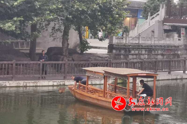 近日,筆者在長(zhǎng)安河畔人字橋上看到一個(gè)小伙劃著一條小船,正小心翼翼地用網(wǎng)兜一點(diǎn)點(diǎn)把河道中的垃圾打撈堆在船面上。