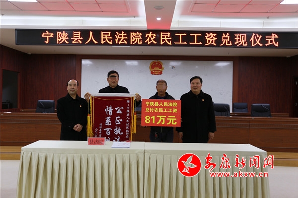 2020年11月25日,當(dāng)接到寧陜法院執(zhí)行局領(lǐng)取工資的通知后,崔某激動(dòng)不已,一大早從佛坪縣西岔河鎮(zhèn)趕到寧陜法院,領(lǐng)取了全部案款812943元,并當(dāng)庭贈(zèng)送錦旗一面,上書“公正執(zhí)法、情系百姓”,他連連說:“真心感謝寧陜法院,幫我要回了拖欠的工資”。