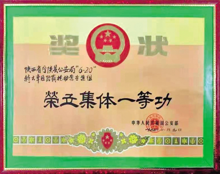 和往常一樣,我正和管理檔案的陳姨一起整理資料,忽然被眼前一塊榮立集體一等功的獎(jiǎng)狀吸引,仔細(xì)查看,發(fā)現(xiàn)上面的詳細(xì)內(nèi)容是:陜西省寧陜縣公安局“6.20”特大車匪路霸搶劫案專案組榮立集體一等功,落款是中華人民共和國(guó)公安部,時(shí)間是1995年8月9日。
