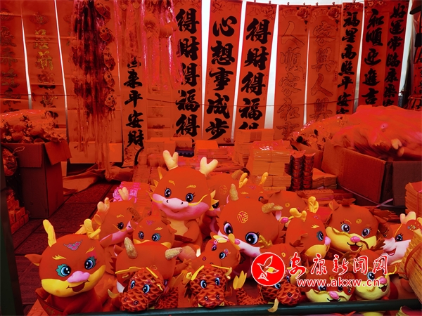 攤主劉女士說:“雖然今年過年時(shí)間比較晚,但是我們的年貨已經(jīng)早早備齊了,最近大家買對聯(lián)的熱情高漲,在新的一年祝愿大家龍年行大運(yùn)、發(fā)大財(cái),龍年吉祥。”