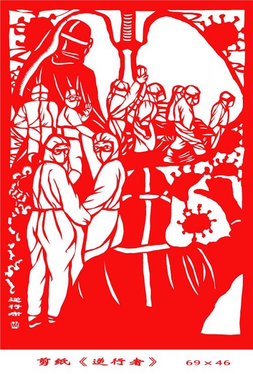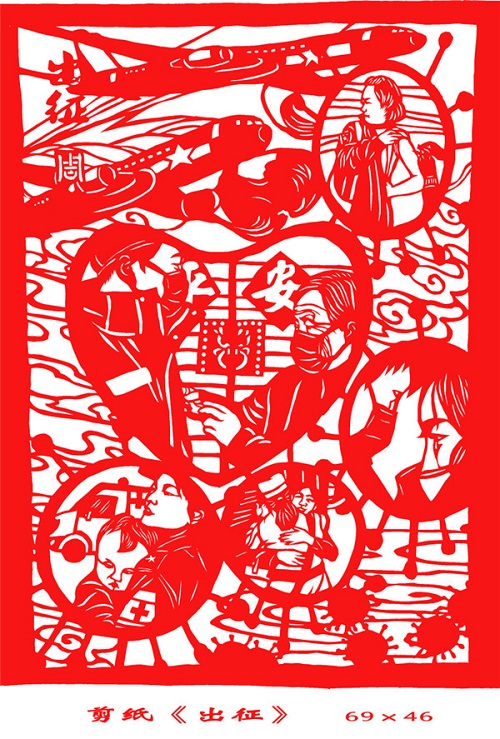 周玉珍作為安康市平利縣的一名小學(xué)美術(shù)教師,在做好學(xué)生、家長疫情防控宣傳教育的同時,戰(zhàn)“疫”中的許多瞬間,令她分外感動。她借個人居家防護(hù)的時機,完成了《出征》《逆行者》《戰(zhàn)疫》三幅剪紙作品,用鮮紅的剪紙記錄下了那些令人感動的瞬間。