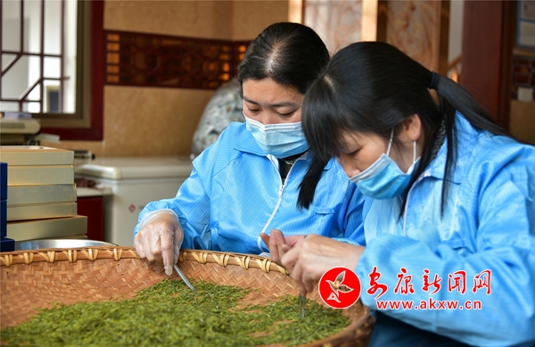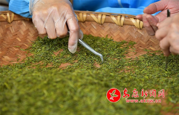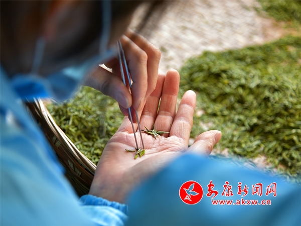 在精選車間,工人們熟練的挑選著茶葉,沖飲的成品茶都是一根根精挑細選出來的,每斤成品茶有上萬顆芽葉。