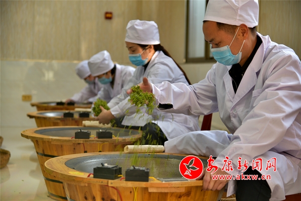在綠茶生產(chǎn)車間,陣陣茶香撲面而來,沁人心脾。嫩綠的茶芽在制茶師們手中翻飛,炒鍋中響起“噼噼啪啪”的聲音,熱氣縷縷升騰,只見制茶師施展抖、悶、揚 、理條、壓、翻等手工制茶動作,鮮嫩的茶芽通過殺青、做形、烘干后根根緊直似針,翠綠養(yǎng)眼的新茶即誕生“出爐”。