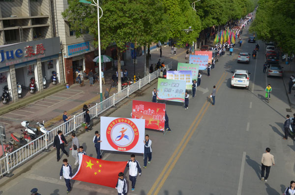 在豪邁的運(yùn)動(dòng)員進(jìn)行曲中,彩旗隊(duì)、運(yùn)動(dòng)員代表隊(duì)、裁判員方隊(duì)、文藝表演方隊(duì)依次走過(guò)主席臺(tái)接受檢閱。運(yùn)動(dòng)員們鏗鏘有力的步伐、響亮的口號(hào),以颯爽的英姿展示著我縣廣大師生健康向上、團(tuán)結(jié)進(jìn)取的良好精神風(fēng)貌。本屆運(yùn)動(dòng)會(huì)為期三天,分設(shè)城關(guān)中學(xué)、縣體育場(chǎng)兩個(gè)賽點(diǎn),來(lái)自全縣各中小學(xué)26支代表隊(duì)931名運(yùn)動(dòng)員將參加籃球、乒乓、田徑三大項(xiàng)共62個(gè)小項(xiàng)的比賽,參加本次開幕式文藝表演的學(xué)生達(dá)2000人,運(yùn)動(dòng)會(huì)規(guī)模創(chuàng)歷年之最。