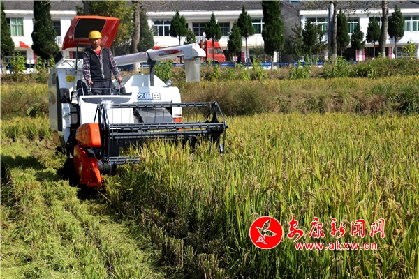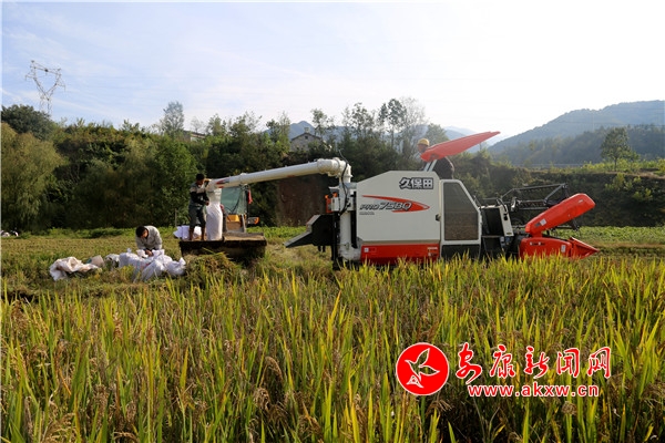待糧艙裝滿,鄭書鵬按動電鈕,合作社的工人迅速拿著編織袋對準出糧口,金黃的稻子從艙內(nèi)傾斜而出,“嘩啦啦”翻滾進口袋,不一會兒袋子便鼓了起來,看著飽滿的谷粒,鄭書鵬忍不住捏起幾粒搓了皮塞到嘴里咀嚼起來。“今年合作社買了一臺收割機,小半天不到幾塊不成型的小田已經(jīng)全部收割完。以前靠人工收割,全村出動要忙活一個周才能收完,現(xiàn)在有了收割機,還能為周邊市縣的種植戶提供服務。”良田村合作社負責人鄭書鵬喜滋滋地說。