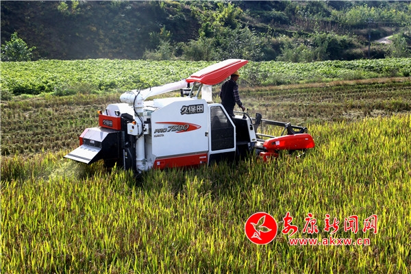 稻田里,收割機正在縱橫馳騁,所到之處稻穗被“大口吞進”,金燦燦的谷粒歡快地蹦進儲存艙里,伴隨收割機尾部吐出的碎末,秸稈瞬間被粉碎還田。