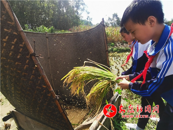 在學校老師的組織下,學生紛紛變身“小農(nóng)夫”,有模有樣地實操起來,左手抓緊稻稈,右手揮舞鐮刀,只見一排排稻谷被割倒,整齊地擺放在稻田里,另一組學生緊握稻稈,用力舉過頭頂摔打稻穗,一粒粒金色的稻谷脫稈而出,堆積在拌桶之中。孩子們忙得熱火朝天,不時傳來陣陣歡笑聲。