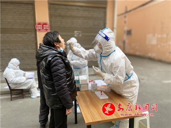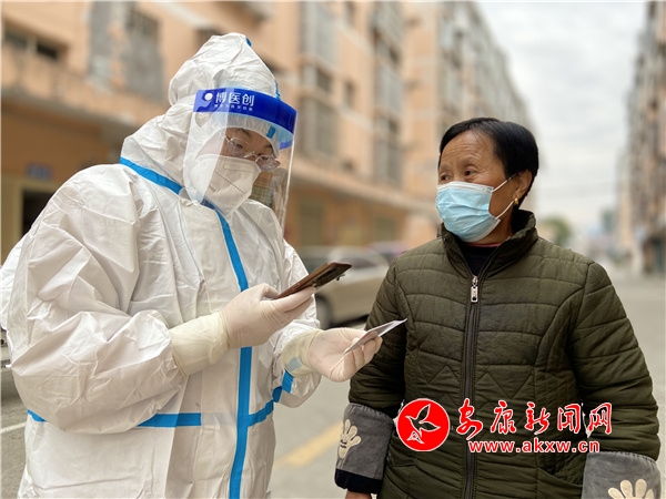 一人接著一人,一戶接著一戶,入戶采樣人員分散多地,醫(yī)護(hù)人員不停走村入戶,奔波于不同的小區(qū),不同的樓層,拼著勁,拎著大包小包的防護(hù)與采樣物資,互相鼓勵(lì)著爬樓梯。每一次敲響居民家門,每到一戶家中,他們都會對居民進(jìn)行詳細(xì)的信息登記、采樣、消毒,每個(gè)環(huán)節(jié)采集人員都一絲不茍地規(guī)范操作,叮囑每一位居民要做好防護(hù)。