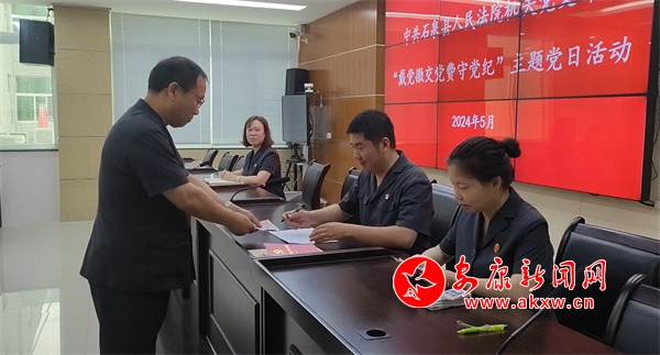 本網(wǎng)訊(通訊員 趙宇) 為進(jìn)一步強(qiáng)化黨員意識(shí),增強(qiáng)黨員的歸屬感和榮譽(yù)感,近日,石泉法院組織開展“戴黨徽交黨費(fèi)守黨紀(jì)”主題黨日活動(dòng),院黨組書記、院長蔣曉安以普通黨員身份,帶頭繳納黨費(fèi)。