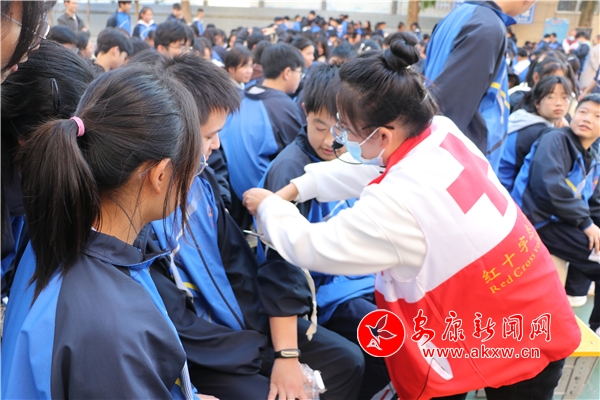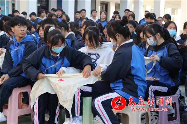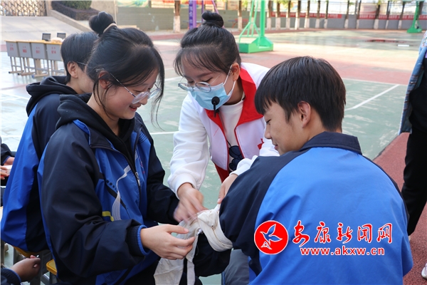 活動(dòng)中,縣紅十字會(huì)工作人員向?qū)W生發(fā)放了三角巾,現(xiàn)場(chǎng)向?qū)W生講解了三角巾的結(jié)構(gòu)和各部分的功能,并以手臂、肩部和胸部三個(gè)部位受傷為例做了操作示范,手把手地指導(dǎo)學(xué)生如何包扎、如何敷料、如何固定、如何打結(jié)。同學(xué)們邊觀察邊實(shí)操,不時(shí)和工作人員進(jìn)行互動(dòng),尋求專(zhuān)業(yè)指導(dǎo),親手體驗(yàn)三角巾包扎的操作流程,在鍛煉動(dòng)手實(shí)踐能力的同時(shí),掌握身體受傷的應(yīng)急處理技能,增強(qiáng)應(yīng)對(duì)突發(fā)事件的自護(hù)自救和科學(xué)救護(hù)能力。