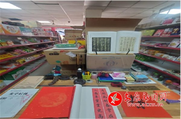走進(jìn)店里,除了琳瑯滿目的商品外,貨架旁還放置了一張桌子,那是沈古頂日常練習(xí)書法的地方。他每天都會(huì)抽出兩到三小時(shí)練字,從不落下一天。常有老顧客向他求墨寶,他總是欣然答應(yīng),為顧客認(rèn)真寫好每幅字。近年,縣煙草公司在商戶中成立了誠(chéng)信經(jīng)營(yíng)互助組織,沈古頂?shù)?ldquo;字謎”隊(duì)伍更加壯大了。他不但用書法為自己筑就了一方桃花源,也在大家之間架起了一座促進(jìn)交流、建立友誼的連心橋。
