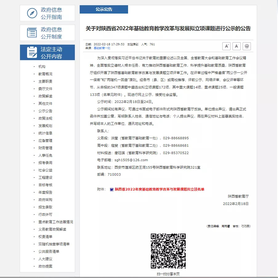 2月18日,陜西省教育廳公布了2022年陜西省基礎教育教學改革與發(fā)展課題擬立項名單,旬陽中學有2項課題獲得立項。