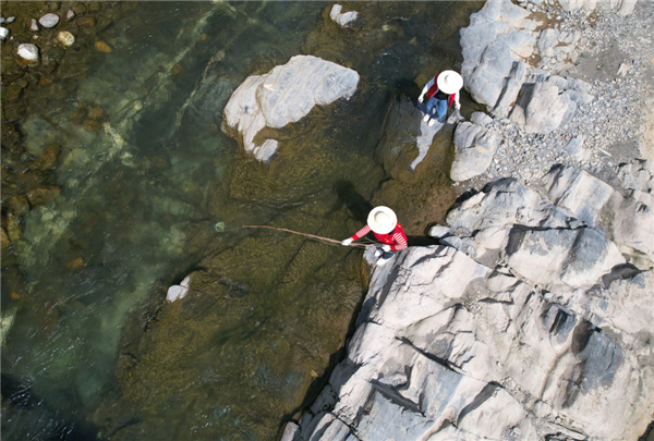 4月10日,女子志愿護(hù)河隊隊員在陜西旬陽市雙河鎮(zhèn)高坪社區(qū)河邊撿拾垃圾(無人機(jī)照片)。 新華社記者 邵瑞 攝