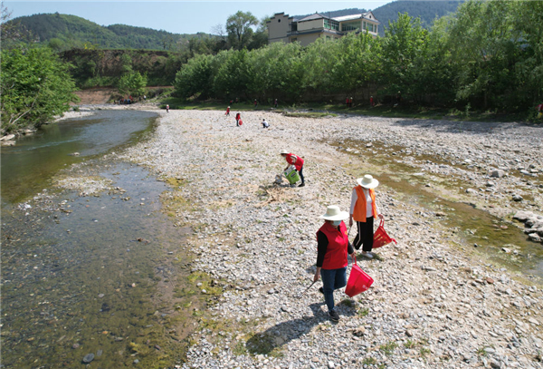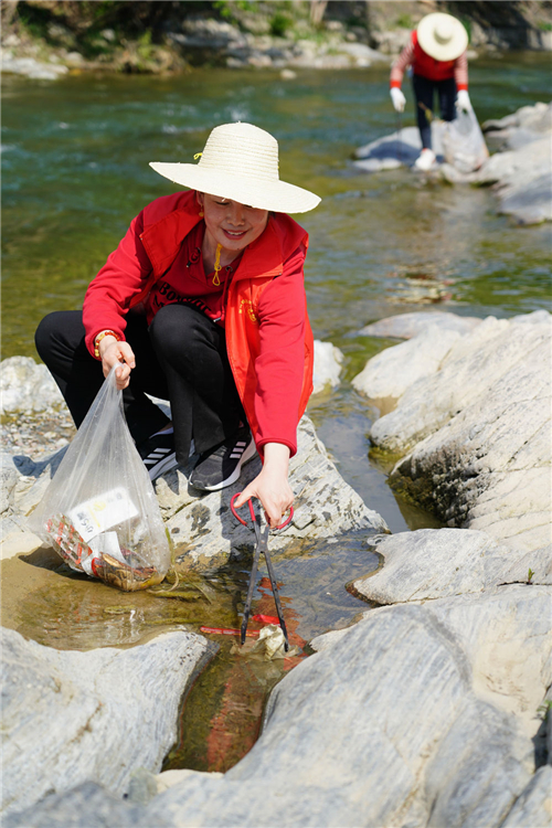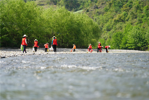 4月10日,女子志愿護(hù)河隊隊員在陜西旬陽市雙河鎮(zhèn)高坪社區(qū)河邊撿拾垃圾。