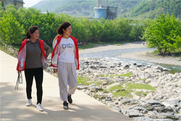 4月10日,在陜西旬陽市雙河鎮(zhèn)高坪社區(qū)河道旁,女子志愿護(hù)河隊隊員撿拾完垃圾后離開。 新華社記者 邵瑞 攝