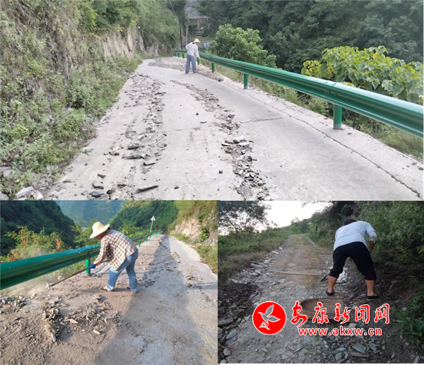 6月下旬,一場暴雨來襲,緩解旱情的同時,又將三組陽在梁(小地名)的通組主干道沖擊損毀,這不僅使三組村民出行困難,更是阻斷了金銀花外銷的交通道路。得知這一情況后,市司法局駐村工作隊和村“兩委”立即組織公益崗對道路進行自救修復。