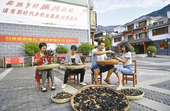 (七月三十一日, 在鎮(zhèn)坪縣聯(lián)合村的巴山臘味小鎮(zhèn),村民楊大兵(右二)與家人正在清洗巖耳。巴山臘味小鎮(zhèn)是陜西省十二個農(nóng)村特色產(chǎn)業(yè)小鎮(zhèn)之一,每年吸引不少省內(nèi)外……