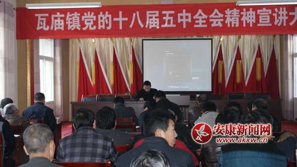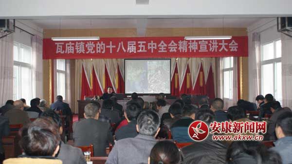 安康新聞網訊 (通訊員 周洪波 張景凡) 為深入學習宣傳貫徹黨的十八屆五中全會精神,切實把廣大干部群眾的思想和行動統一到全面深化改革的決策部署上來,近日,瓦廟鎮(zhèn)召開黨的十八屆五中全會精神宣講大會,鎮(zhèn)、村全體干部及駐鎮(zhèn)單位負責人共計85參會。