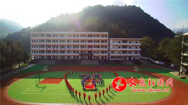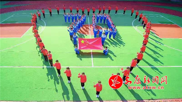 幾十名身穿藍(lán)色班服的學(xué)生在操場正中央排成數(shù)字“70",在數(shù)字正前面,四名同學(xué)展開國旗,然后,數(shù)十名身穿紅色班服的學(xué)生在外圍圍成"心"形。"70",象征著70周年,"心"型, 寓含著孩子們對偉大祖國的熱愛。整個造型寓意深刻,活動表現(xiàn)形式新穎獨特,令人耳目一新。
