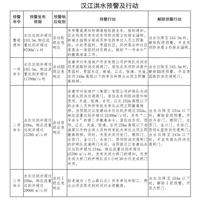 根據(jù)《安康市人民政府關(guān)于印發(fā)安康城區(qū)防汛抗洪預(yù)案的通知》有關(guān)漢江洪水預(yù)警及行動(dòng)的內(nèi)容: