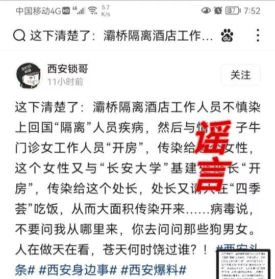 網(wǎng)上流傳一張確認病例傳播鏈分解圖,在病例之間標注“情人”關系,并傳言此次疫情傳播因素之一,是因為西安首例病例與子牛門診的護士為情人關系,導致疫情擴散,經(jīng)核實,該圖盜用華商網(wǎng)12月18日制作的新聞作品圖片。該信息為虛假信息,造謠的人已被拘留。