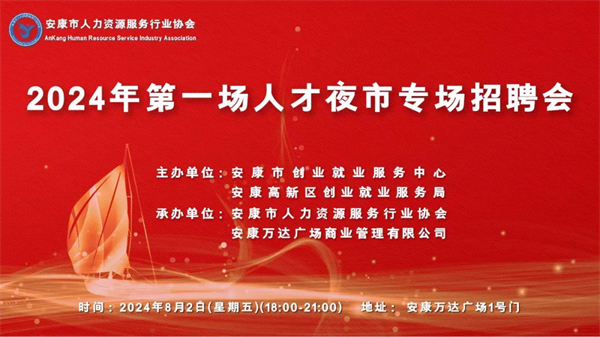 為有效保障企業(yè)用工需求,促進(jìn)未就業(yè)高校畢業(yè)生、退役軍人、城鎮(zhèn)失業(yè)人員、返鄉(xiāng)農(nóng)民工等各類人員就業(yè),安康市創(chuàng)業(yè)就業(yè)服務(wù)中心、安康高新區(qū)創(chuàng)業(yè)就業(yè)服務(wù)局定于2024年8月2日(星期五)在安康高新區(qū)萬達(dá)廣場(chǎng)1號(hào)門舉辦2024年第一場(chǎng)人才夜市專場(chǎng)招聘會(huì),現(xiàn)將活動(dòng)事項(xiàng)公告如下: