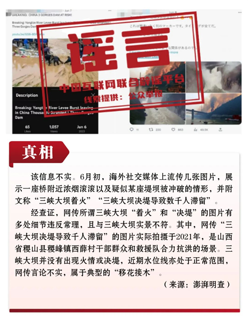 移花接木,憑空捏造事實博關注?v觀6月網絡謠言,還需警惕的是,個別網民為博取關注,不惜移花接木、憑空捏造不實信息。如有網民惡意造謠“山西一女幼師給幼兒喂避孕藥”“上海仁濟醫(yī)院(東院)存在醫(yī)生嫖娼、組織賣淫”,經調查,這些人造謠的目的純屬是為了吸引眼球、博取關注,均已被警方依法嚴肅查處;海外社交媒體上流傳所謂“三峽大壩‘著火’‘決堤’”,也是以移花接木伎倆,往我國家標志性工程身上“潑臟水”;而網傳“上海市司法局擬錄用的38名公務員大部分是留學生”,則是對今年上海公務員招錄工作的歪曲混淆、以偏概全,其真實目的是吸引眼球、獲取流量,謀取私利。