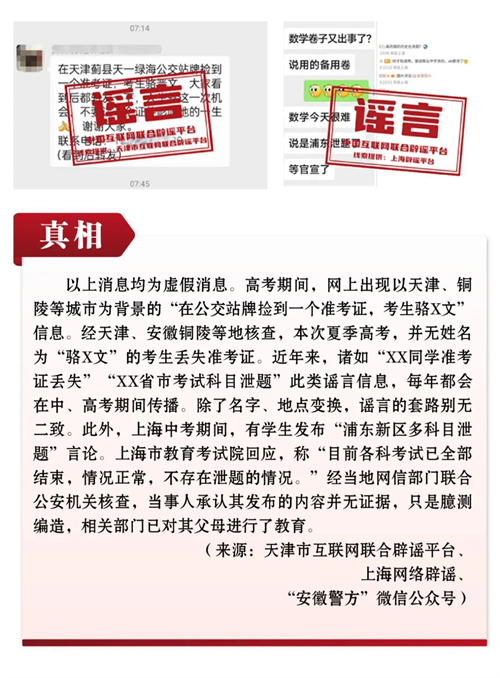 謠言7:天津、安徽等地考生“駱X文”丟失準考證?上海浦東新區(qū)中考多科目泄題?