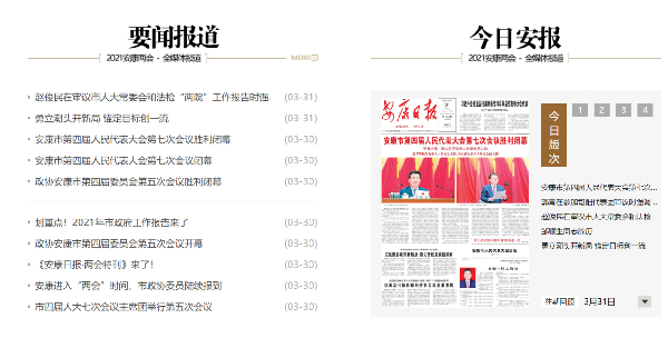 2021年安康“兩會”期間,安康新聞網(wǎng)精心策劃推出《聚焦兩會》《兩會視頻》《圖說兩會》等“兩會”專欄專題。采編人員群策群力,運用圖文、視頻等形式宣傳兩會聲音。創(chuàng)新傳播形式,讓兩會的聲音傳播得更廣更遠(yuǎn)。安康新聞網(wǎng)站負(fù)責(zé)搭建數(shù)字閱報機(jī)及配套建設(shè)加強(qiáng)了安康“兩會”宣傳展示效果,取得良好社會影響。